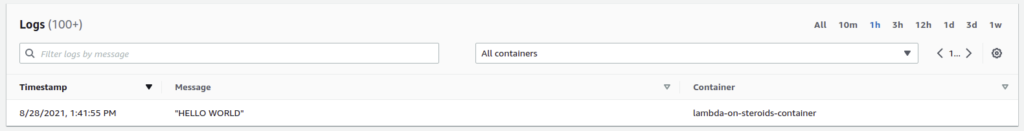 In the Advanced Options, we can override any task definition settings we created, for example, we are overriding the command for our task definition. Note that you must provide the commands in comma separated manner and then hit Run Task. It will take you to your cluster’s tasks option and you will see a task being Provisioned. Click on it and then hit Logs. Wait for the logs to appear and voila;