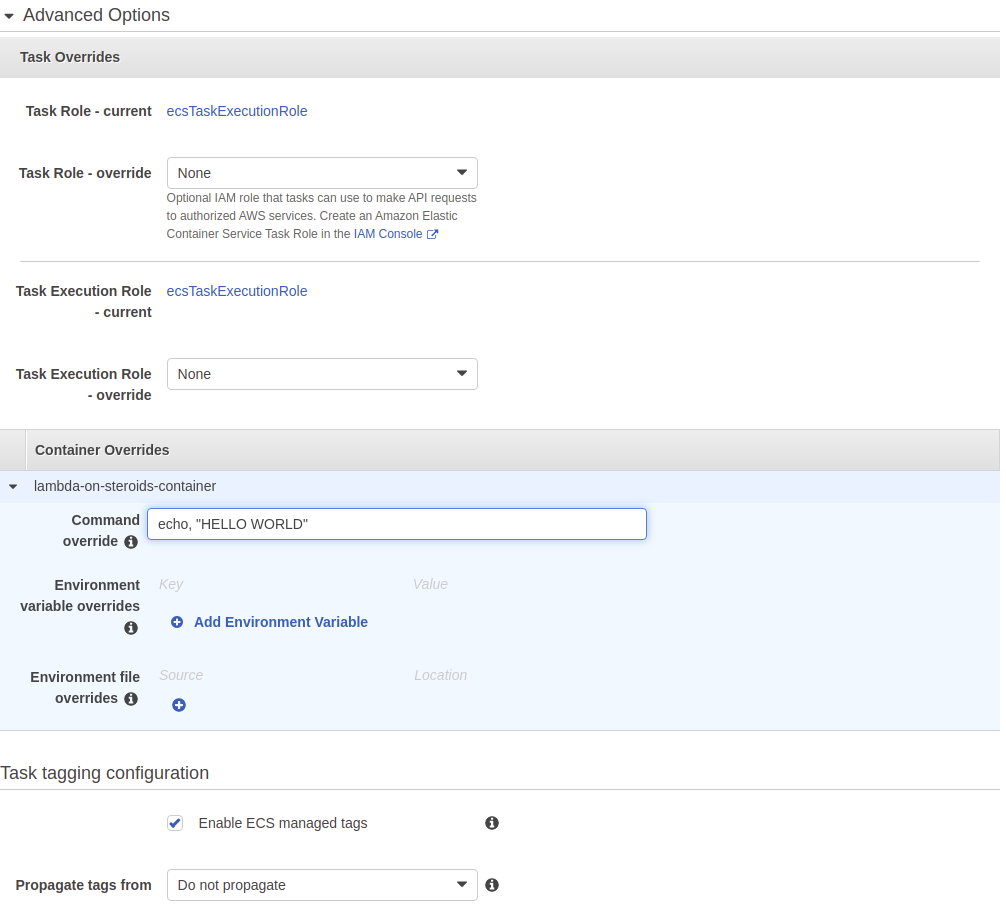 Now, ecs is not meant to be a lambda substitution, this can be used for tasks that require custom applications and scripts or heavy resources or when you are just not comfortable with the 15 minutes timeout.
