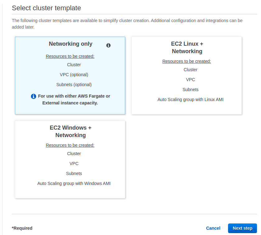 We will use the first option to use the cluster as Fargate (Serverless compute for containers) Hit Next step.