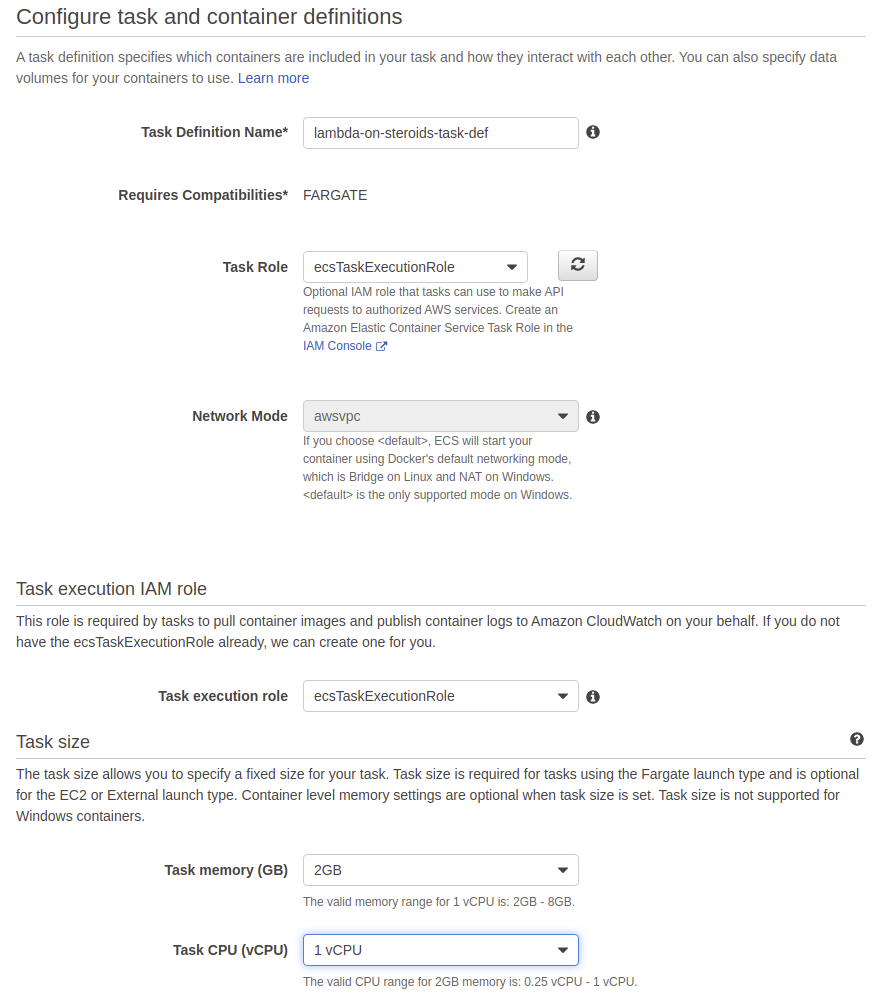Give your task a name. You can select the amount of default resources you want your container to have; for example, we will use 2 gigs of ram, and a single vCpu but you can always change these for each task you run.