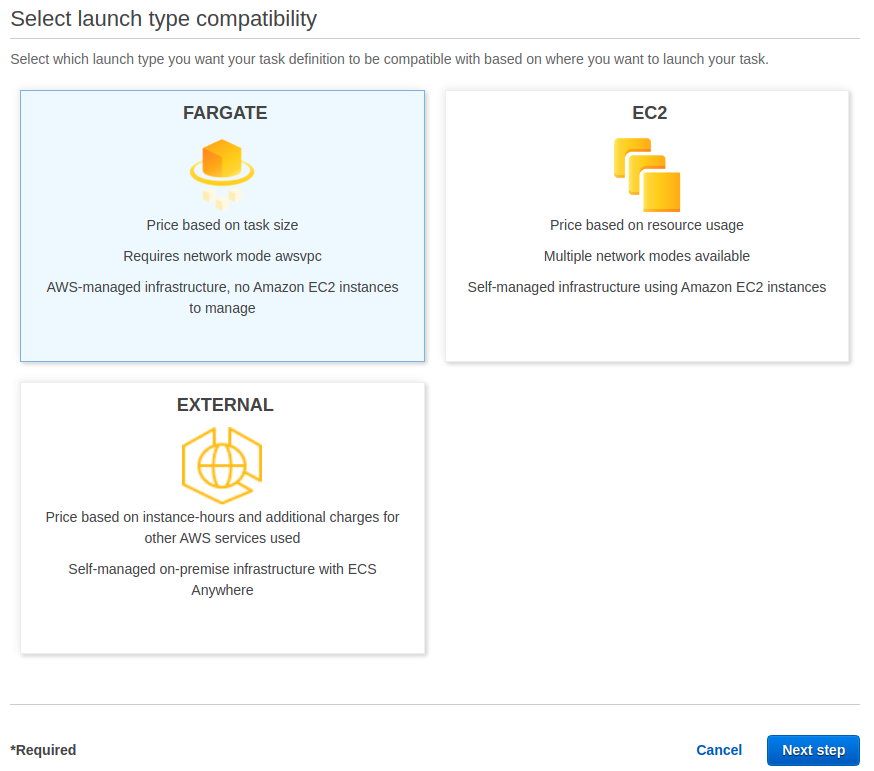 We will use FARGATE here too to manage our clusters and tasks. Click Next step.