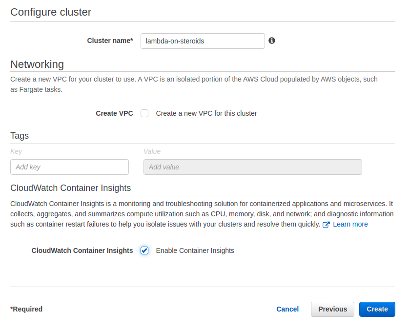 Give it a name and make sure to enable Cloudwatch insights cause they are always helpful. We are not creating a VPC because this account already has one, you can create one if you still need it. Hit Create.