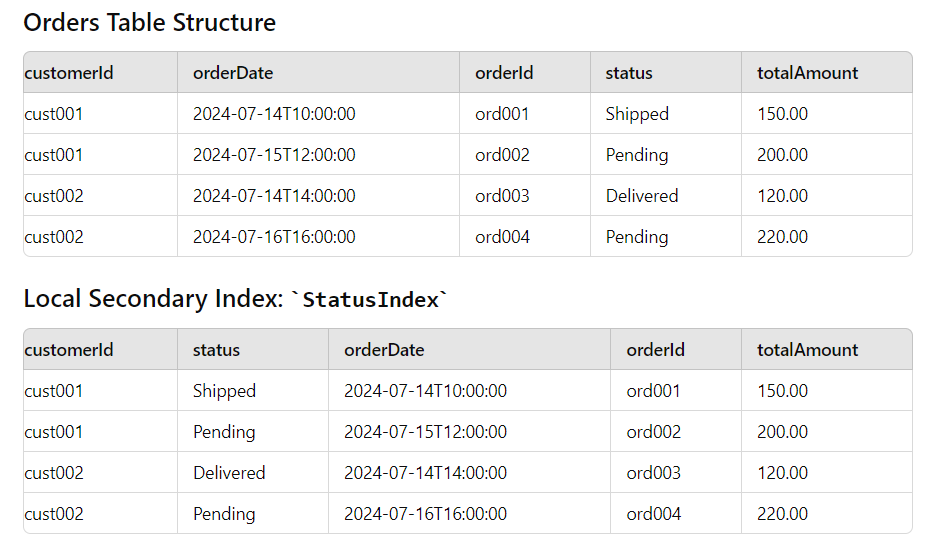 5. Global and Local Secondary Indexes: It enables another layer of flexibility as far as querying is concerned. In LSI one can add another sort key along with the present sort key and partition key. But if one uses an LSI the partition size automatically becomes a 10gb of size. One can use at most 5 LSI for one table design and it comes free of cost meaning aws will not charge you any penny if one uses any kinds of LSI in a table.