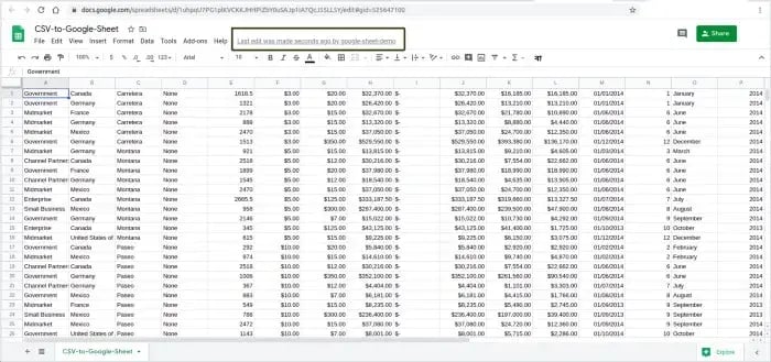 Now run the Python script with this command python upload.py and open CSV-to-Google-Sheet Google Sheet in your browser. You will see that your Google Sheet is updated with the content of the CSV file as follows.