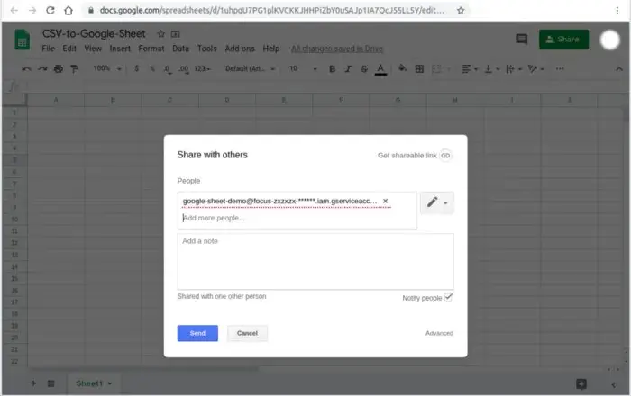 Now go to your Google Drive and create an Google Sheet and name it CSV-to-Google-Sheet. Copy client_email value from the JSON file you have downloaded above and share that Google Sheet to this client_email with edit permission like the image below.