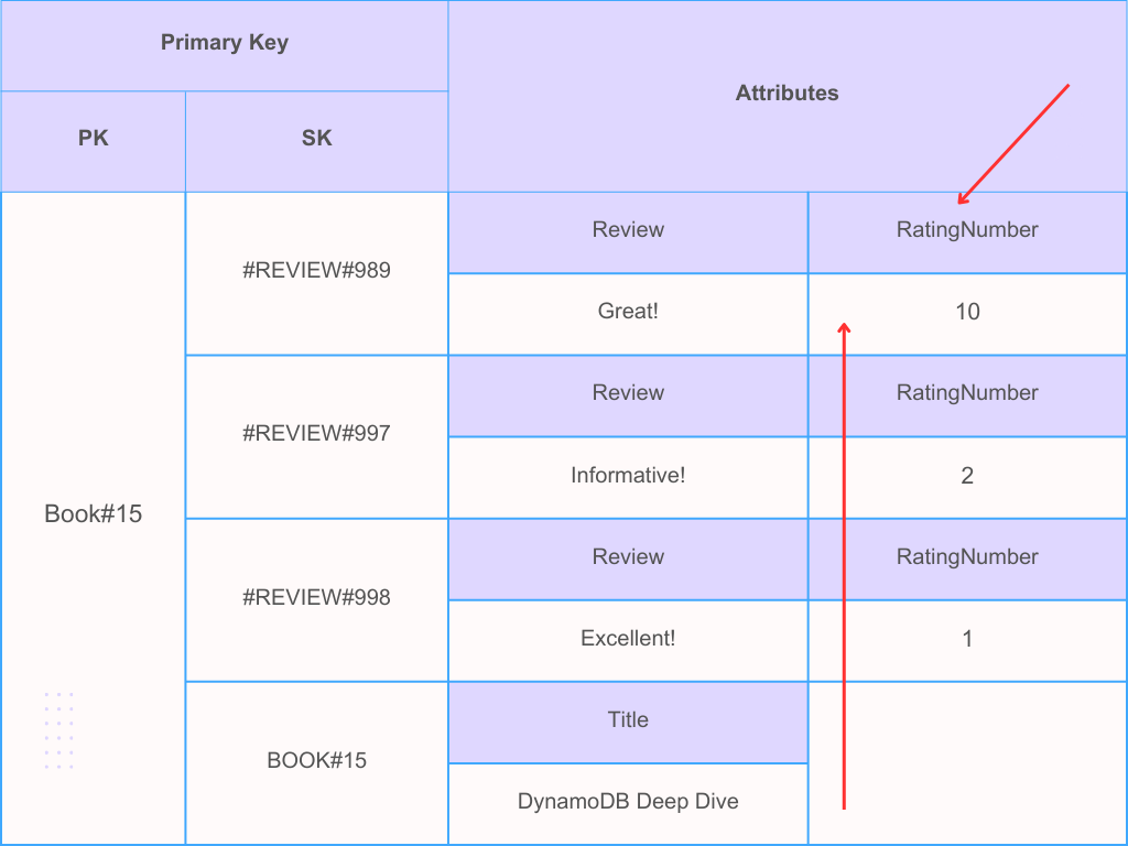 One should be aware of lexicographic sorting with numbers represented as strings. For better demonstration. Let’s revisite our above ‘Book Review’ example and now we are using ‘RatingNumber’ instead of timestamps for the sort key.