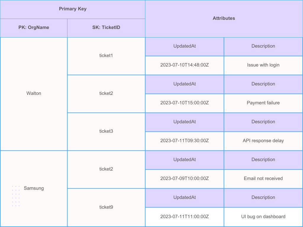 This database design uses the organization name as a partition key for ‘group by’ functionality and sorting tickets with the ‘UpdatedAt’ field as a sort key for order. However, this design has limitations, as the primary key cannot be changed during item modification. In your case, you have included ‘UpdatedAt’ field into the primary key which changes each time a ticket is updated. So whenever you update a ticket item, first delete the existing ticket item, and then create another new one with updated primary key. causing a complicated process and potential data loss if not handled properly.