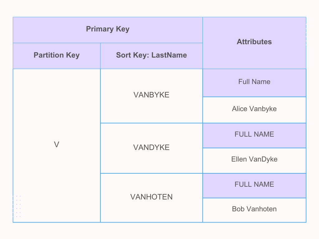 A common mistake people make with lexicographical ordering is forgetting the uppercase rule. For instance, consider an item collection with names “Ellen VanDyke” (with a capital “D” in the middle of VanDyke), ‘Alice Vanbyke’ and ‘Bob Vanhoten’, In an item collection using these last names as SK. it might turn out as follows:
