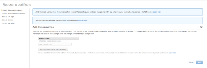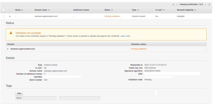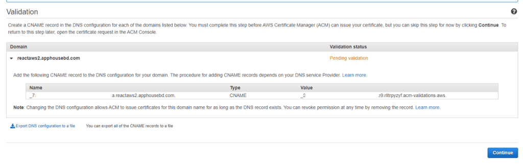 - For verifying the custom SSL certificate. In this case, the name and value you will get from the AWS, the image we’ve shown just before.