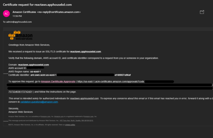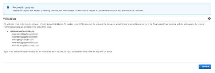 - Email validation: It uses some pre-configured email address to send you a validation email where you will be asked to verify that you requested the SSL certificate. If you accept that, then it will create an ACM SSL certificate in AWS. The email addresses are: