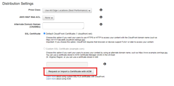 To get the SSL Certificate, if you already don’t have one, you can just click the Request or Import a Certificate with ACM from the distribution page.