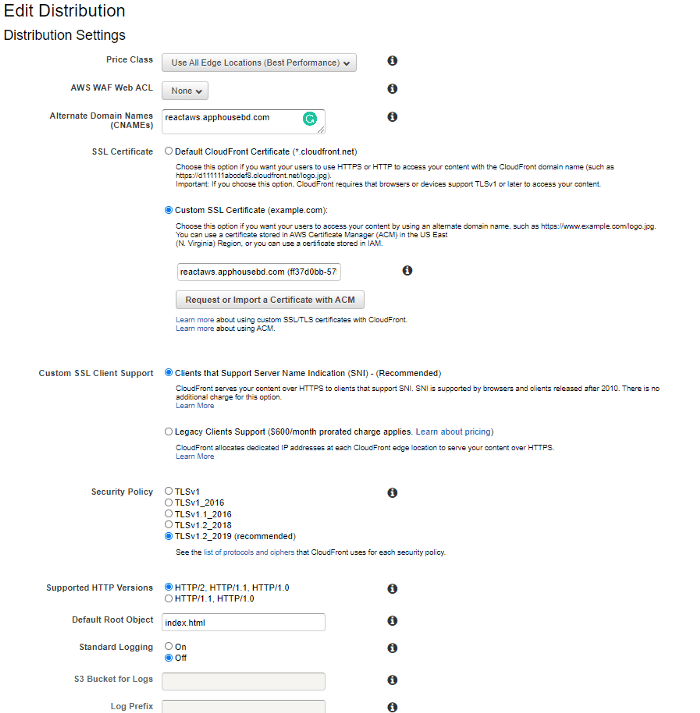 Now let’s set up the other fields that we need. We will keep the default value for the following fields: Enable Origin Shield, Origin Connection Attempts, Origin Connection Timeout, Smooth Streaming, Restrict Viewer Access(Use Signed URLs or Signed Cookies), Compress Objects Automatically, Supported HTTP Versions, Enable IPv6.