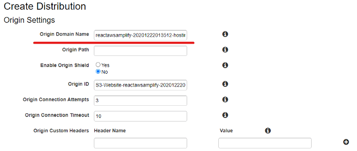 If you click on the Origin Domain Name input box, AWS will suggest the S3 buckets you have along with some other options. We need to select the one we created in Part 1, which was reactawsamplify-20201222013512-hostingbucket-dev. But there is a catch, we can’t just select the bucket from the drop-down as it will only point the distribution to the bucket, which we don’t want. We want the distribution to point at the hosting site. So instead of just writing the name of the bucket, we will write the entire hosting URL.