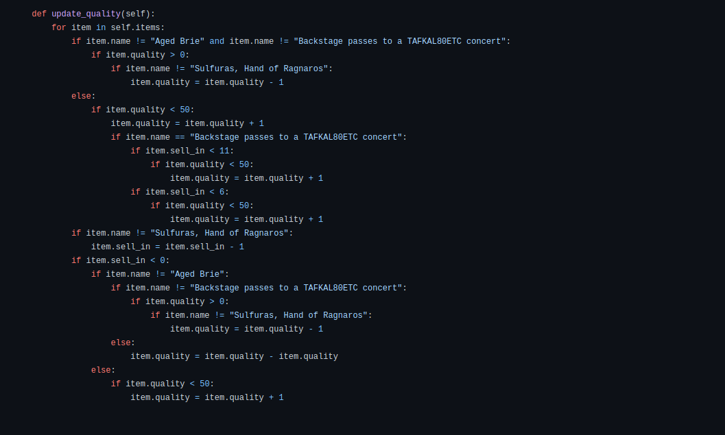 If you look at the current state of Gilded Rose’s codebase, especially the update_quality method of the GildedRose class, you’ll see how messy it is.