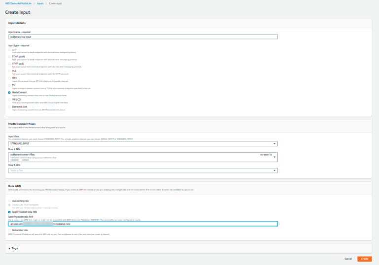 We have selected input type MediaConnect and added our MediaConnect Flow and the IAM role in this MediaLive input.