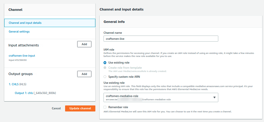 After creating MediaLive input we will create a MediaLive channel. Attaching the input we have created earlier and the IAM role.