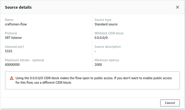Here we are using 0.0.0.0/0 (this is not recommended; you should always use your public ip/range) CIDR block to make the flow publicly accessible for this article. We are using SRT Listener. To know more about SRT click here. We will be using inbound port 5555 to connect to this flow. After creating start the flow.