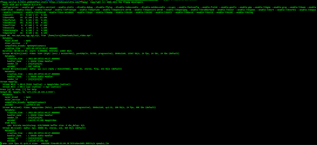 Example: ./ffmpeg -stream_loop -1 -i /home/user/Downloads/test_video_file.mp4 -f mpegts srt://52.18.155.2:5555