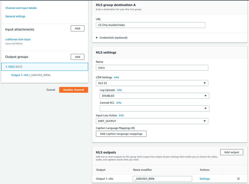 We have selected HLS output. As destination url we have used our newly created s3 bucket and we want our MediaLive output file named as index.
