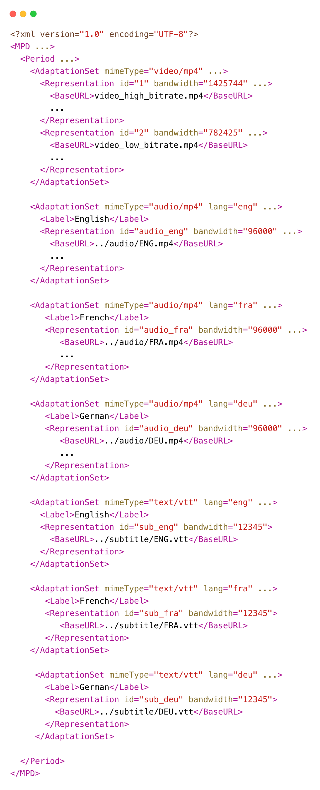 - (Simplified) Integrated DASH Manifest (Video + Audio + Subtitles):
